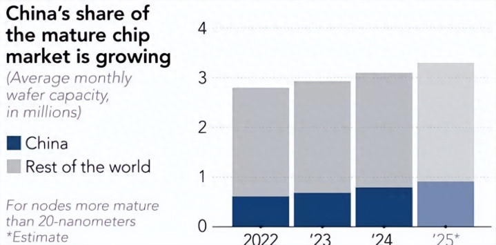 从2013年起,中国芯片产能就稳稳上行,2024年已超全球20%,2025年28%的份额不是天上掉的。Needham的芯片分析师查尔斯·希直说,美国限制先进制程,中国就从成熟领域切入,汽车工业这些需求大国,正好被中国低价产品蚕食。
