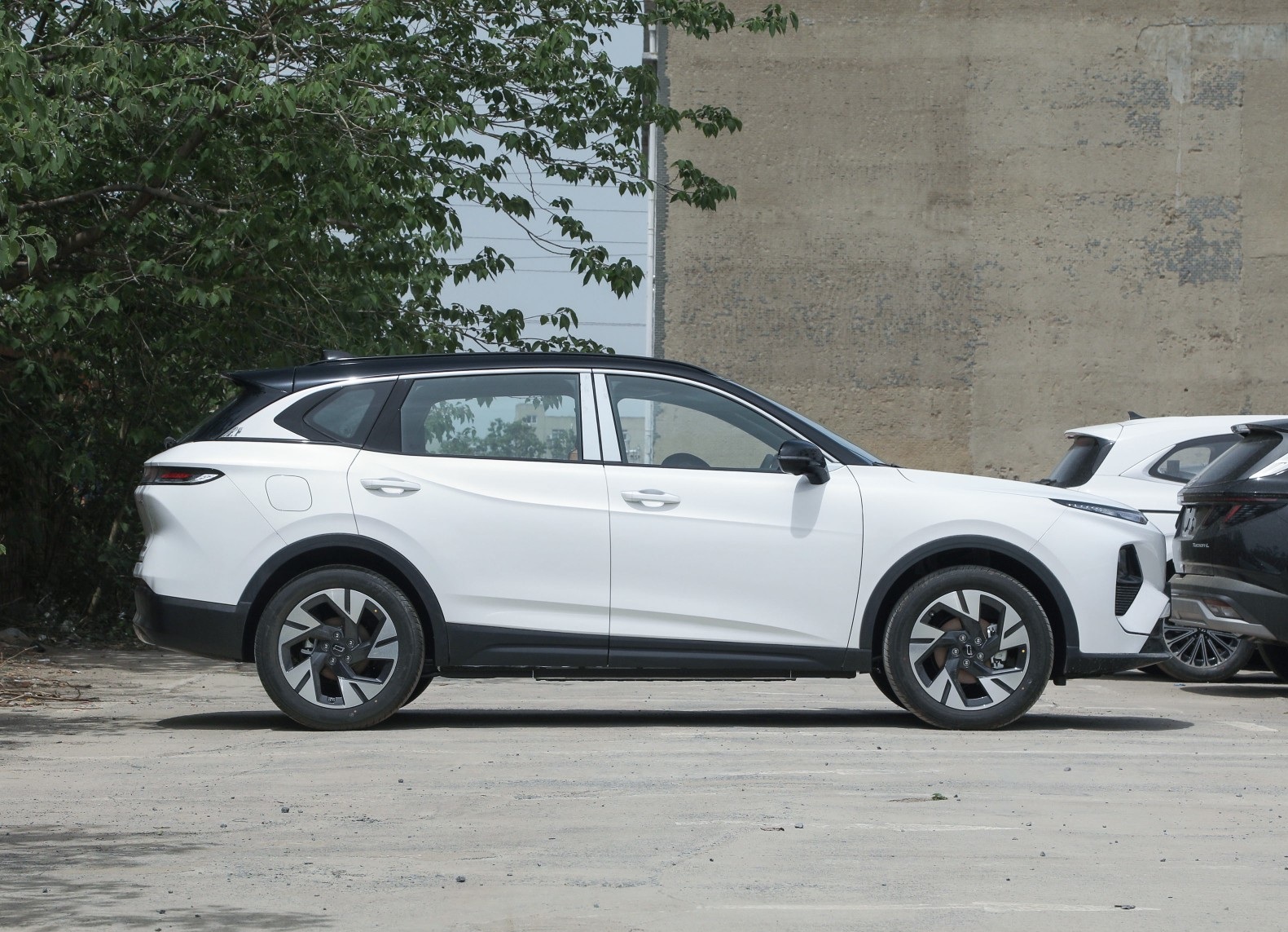 再来看车身侧面部分,4745mm车长与2772mm轴距赋予车身修长比例,双色悬浮车顶配合上扬腰线,营造出蓄势待动的姿态。19英寸低风阻轮毂(高配)与黑色轮眉强化跨界属性,而1880mm车宽与1710mm高度则确保车内空间最大化。侧窗镀铬饰条与隐藏式D柱设计,进一步提升了高级感。整体前低后高的造型更加具有运动视觉效果。